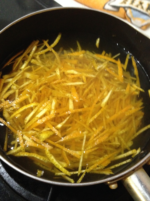 皮を薄くむいて(白い所が苦い)細く切ります。